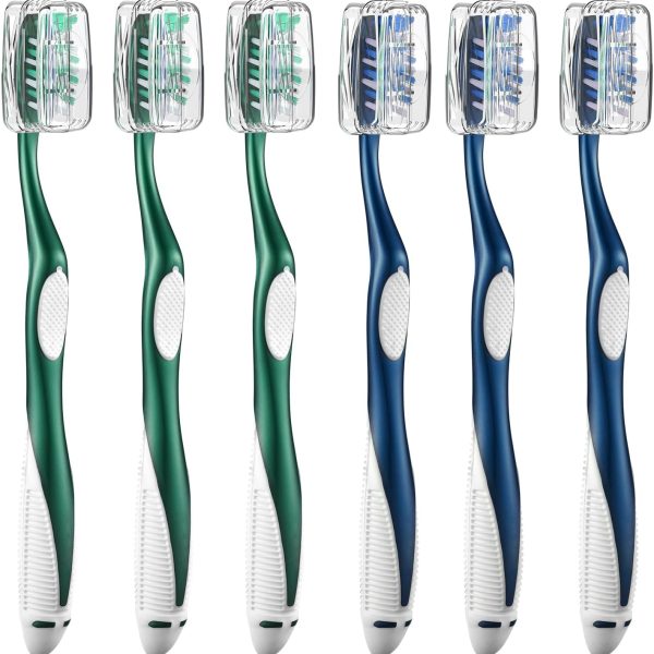 Firm Toothbrushes with Covers for Adults, Cross Hard Bristles, with Built in Tongue Scraper, 6 Count